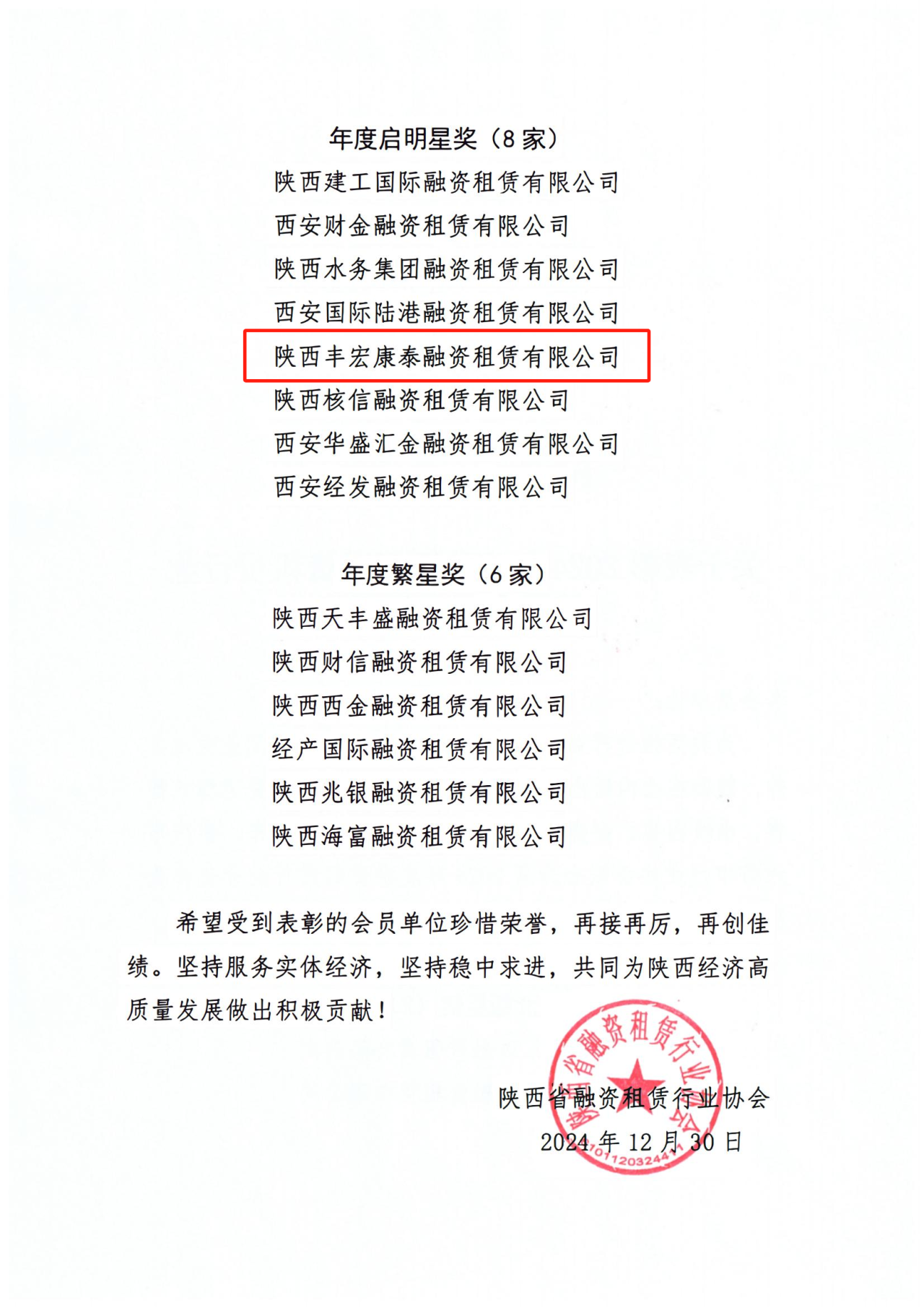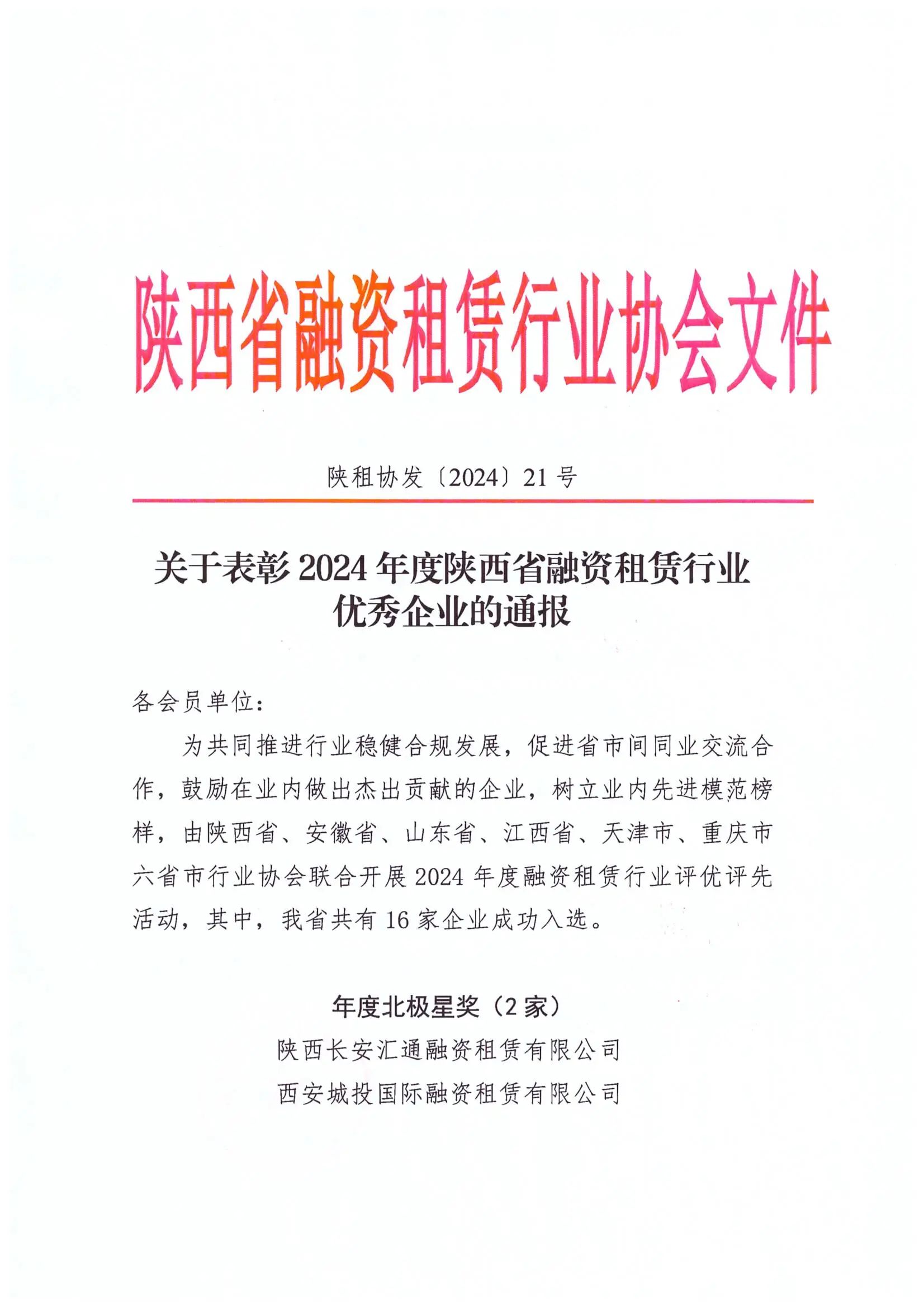 近日,陕西省融资租赁行业协会发布《关于表彰2024年度陕西省融资租赁行业优秀企业的通报》,市PA视讯官方网站集团所属公司陕西丰宏康泰融资租赁有限公司在陕西、安徽、山东、江西、天津、重庆六省市行业协会联合开展的2024年度融资租赁行业评优评先活动中,荣获“年度启明星奖”。