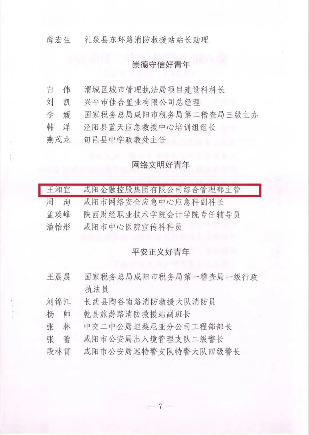 8月4日,第六届“‘中国梦·青年志’——寻找身边的咸阳好青年”颁奖仪式在咸阳市广播电视台举行。金控集团团委副书记王湘宜获得第六届“‘中国梦·青年志’——寻找身边的咸阳好青年”主题活动“网络文明好青年”荣誉称号。
